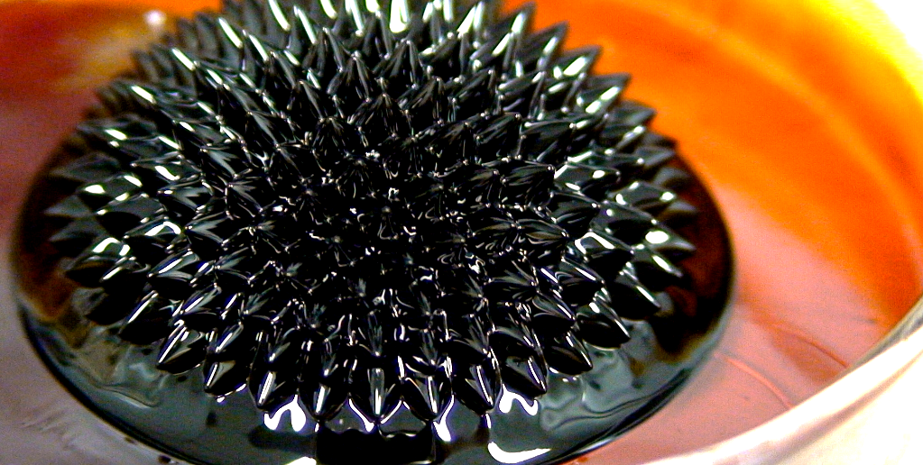 Os efeitos do ferro fluído acima se dão ao aproximar um imã do fluído, gerando a agitação das moléculas. Ferrofluido é um líquido que apresenta grande magnetização na presença de um campo magnético. Os ferrofluidos são compostos por partículas ferromagnéticas (geralmente hematita ou magnetita) em escala nanoscópica suspensas em um fluido, geralmente um solvente orgânico ou água. As nanopartículas ferromagnéticas são revestidas com tensoativos para impedir sua aglomeração (devido ao efeito das forças magnéticas e de van der Waals).