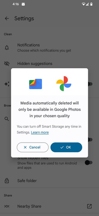 O recurso recém-lançado no Files permite que o aplicativo se comunique com o Fotos — app de armazenamento em nuvem — e delete automaticamente os arquivos que estão armazenados na memória interna do smartphone, mas que possuem um backup nos servidores do Google.