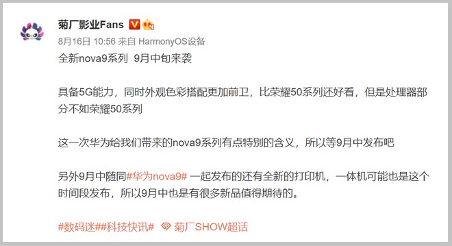 A fonte informa que o novo design é vantajoso em comparação à série do Honor 50, mas em termos de hardware, a linha pode não impressionar. O Nova 9, segundo o Chrysanthemum, terá desempenho geral inferior ao chip que equipa o modelo rival, isto é, o Snapdragon 778G da Qualcomm.