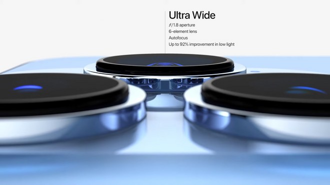 Apple adiciona lente ultrawide nos iPhones 13 Pro e Pro Max com abertura f/1.8, foco automático (destaque desse sensor) e aprimoramento de 92% em imagens capturadas com pouca luz.