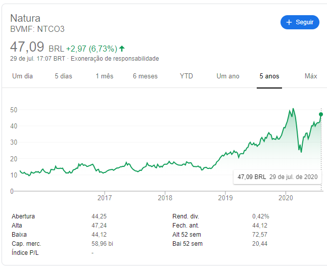 Só nos últimos cinco anos, os papéis da natura tiverem duas altas históricas, uma delas aconteceu nesta quarta-feira, alcançando a valorização de 6,73% no valor das ações da companhia.