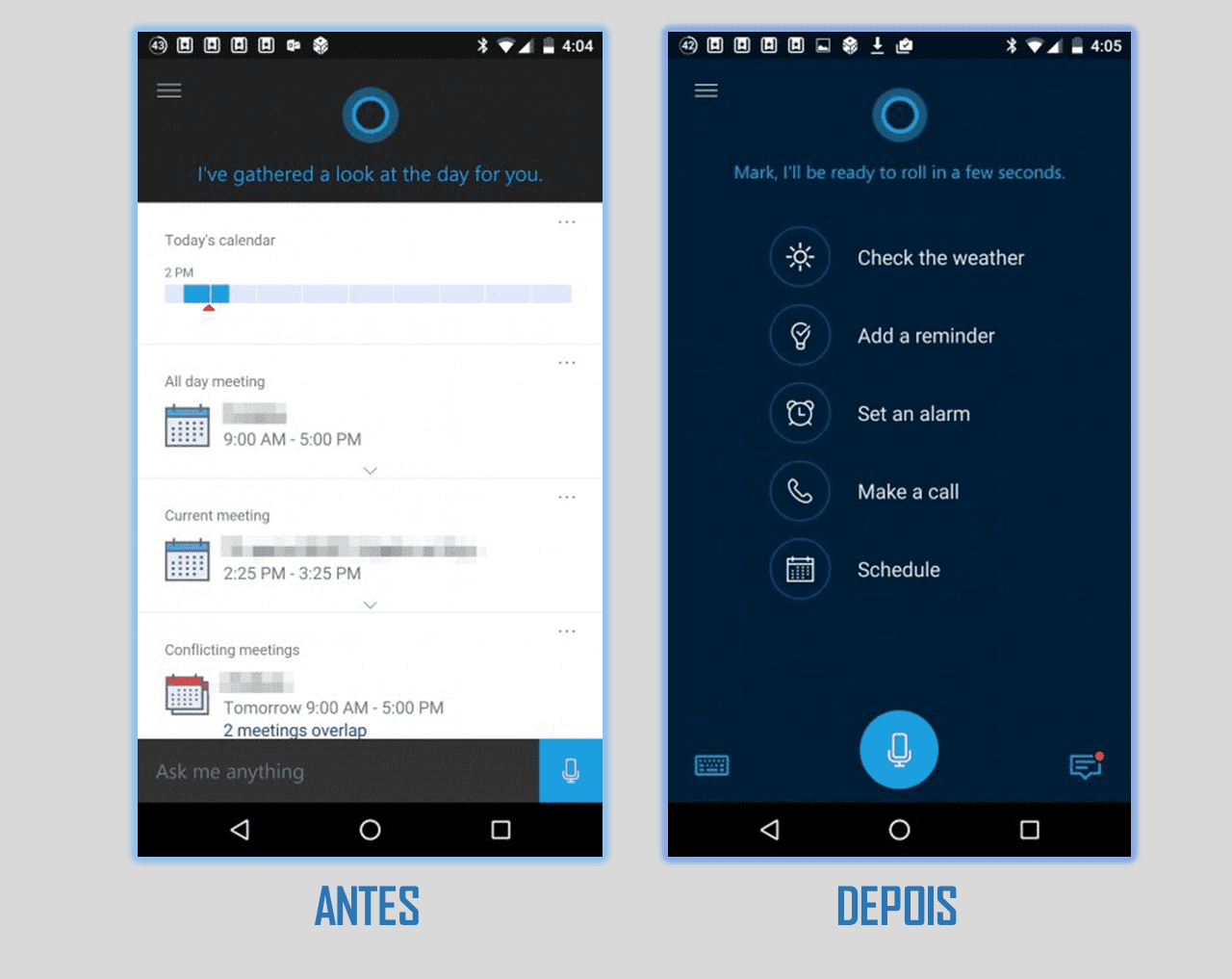 A Microsoft sempre traz mudanças e melhorias nos mais diversos serviços que a empresa disponibiliza aos sistemas operacionais. Assim como no Windows 10 Mobile, a Cortana marca presença no sistema Android e acabou de ganhar uma repaginada em sua tela inicial. O update 1.7.0.1000, a assistente pessoal da Microsoft ganhou um novo visual na tela inicial.