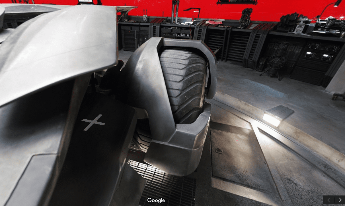 Ao fazer uma visita na BatCaverna através do Google StreetView você vai se deparar com detalhes impressionantes vistos no filme, começando pelo Batmóvel e passando por armas e outros objetos utilizados no desenrolar da ação. É possível encontrar até mesmo a antiga vestimenta do Robin que foi pichada pelo Coringa.