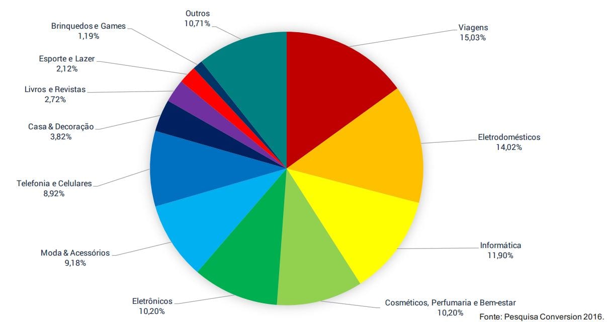 No gráfico abaixo, mostra-se dados sobre a porcentagem de venda de cada setor do E-commerce. O setor de Viagens surpreende por ser o que mais vendeu no ano de 2016;