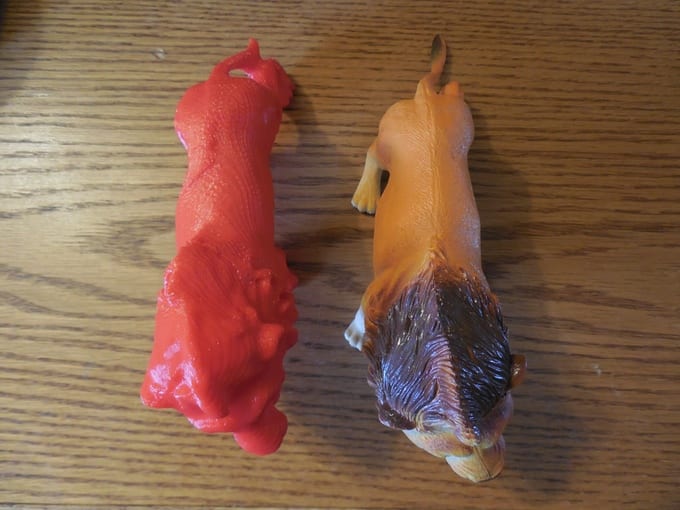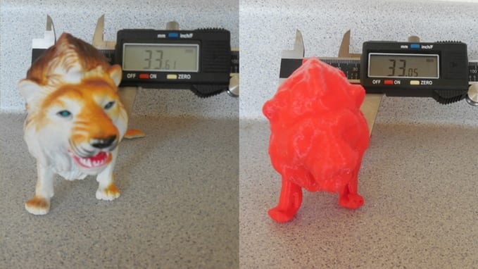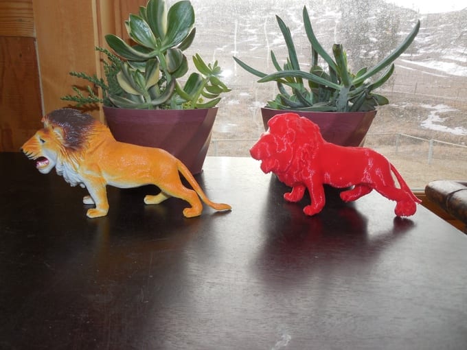 - Brinquedo ‘Leão’ é projetado em uma CowTech Ciclop (lado esquerdo, objeto original. No lado direito, projeto impresso após escaneamento).
