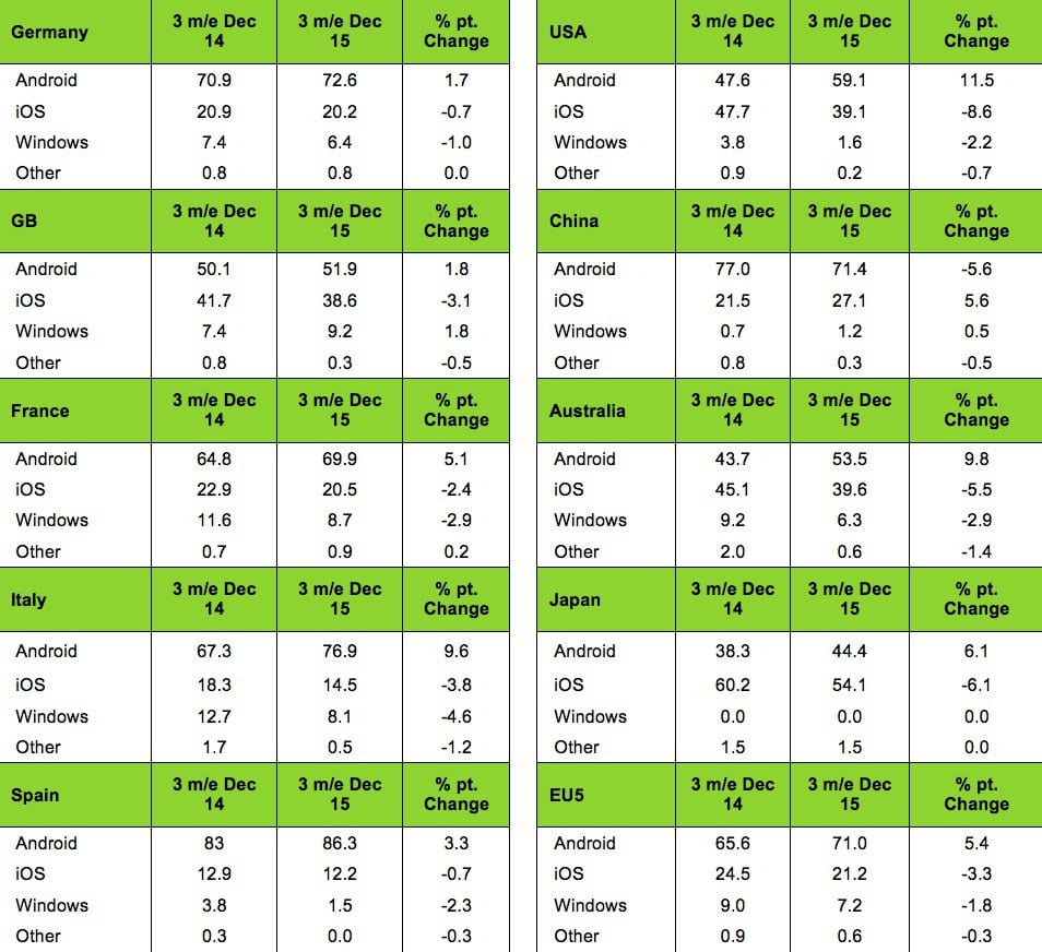Na Europa, o Windows Phone diminuiu 1,8%, juntamente com o iOS que sofreu uma queda de 3,3% nas participações. Em resposta ao Business Insider, Carolina Milanesi, chefe de pesquisa da Kantar, afirmou que o sucesso do Windows Phone no Reino Unido se dá por dispositivos de baixo custo, como o Lumia 535.